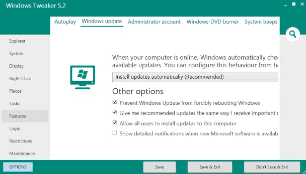 Windows Tweaker is een van de meest krachtige hulpprogramma's als het gaat om het wijzigen van verborgen Windows-instellingen. Je kunt je systeem ermee optimaliseren en Windows volledig naar je hand zetten. Omdat er meer dan honderd instellingen gedaan kunnen worden, is de eerste kennismaking met Windows Tweaker misschien overweldigend. Gelukkig helpt de overzichtelijke interface je snel op weg. Aan de linkerzijde van je scherm zie je categorieën als Explorer (Windows Verkenner), Tasks (taken) en Maintenance (onderhoud). De instellingen in de categorieën zijn weer ondergebracht in tabbladen. Er is dus een goed overzicht.