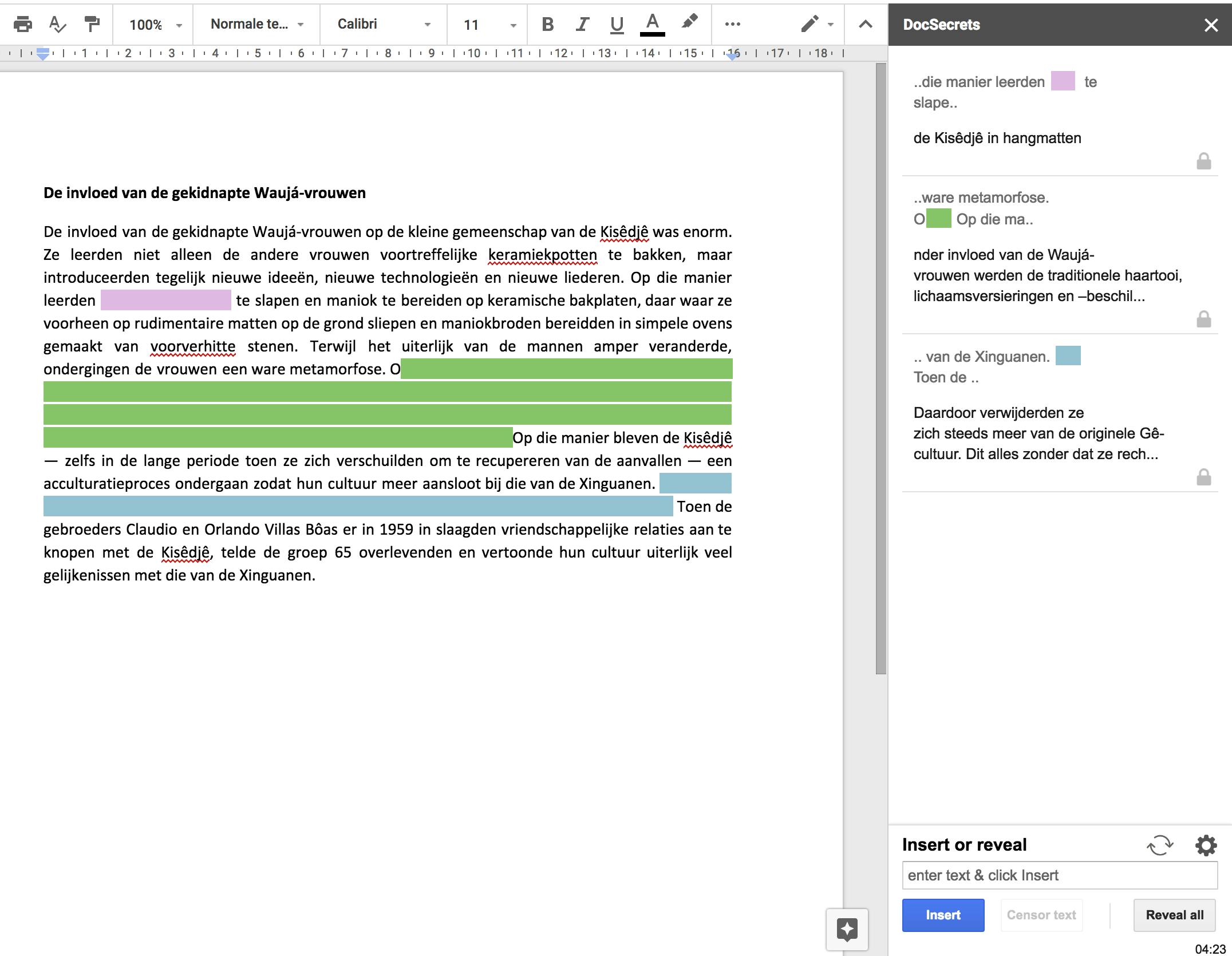 Om bepaalde gevoelige passages in tekst te beschermen tegen nieuwsgierige ogen, gebruik je DocSecrets. Dit is een uitstekende oplossing voor een document dat je wilt delen, maar waarvan je bepaalde informatie wilt verbergen. Deze tool zet een markering over de tekst, en zonder wachtwoord kun je de tekst dus niet lezen. De inhoud wordt veilig afgeschermd via aes-encryptie. Alle data, ook het wachtwoord, blijft deel uitmaken van het document. Een interessante tool, maar we raden niet aan om deze add-on in te zetten om financiële informatie of kritieke wachtwoorden af te schermen.