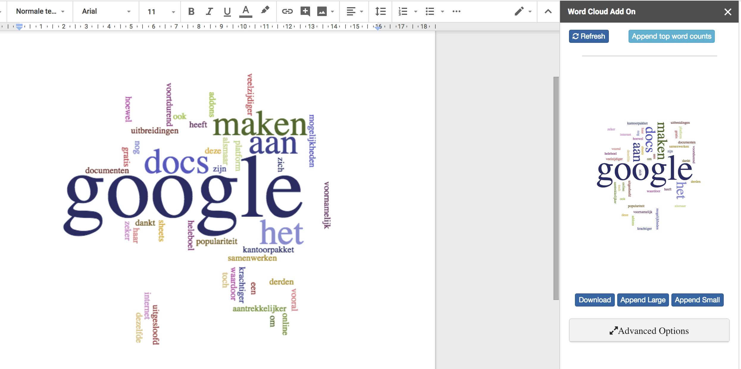 Om heel en makkelijk een woordenwolk te produceren hoef je ook al niet meer naar een of andere online generator uit te wijken. Word Cloud Generator laat je de keuze tussen een klassieke en een moderne woordenwolk, waarbij je verschillende kleurenschema’s kiest in de Advanced Options. Zoals het hoort, zal deze add-on de woorden die het meest voorkomen groter afbeelden dan termen die slechts een paar of één keer in de tekst staan. Je kunt trouwens een lijst opvragen waarin deze generator heeft geteld hoe vaak ieder woord in de tekst voorkomt. Klik je op de knop Append Large, dan verschijnt de woordenwolk als een afbeelding in het Google-document.