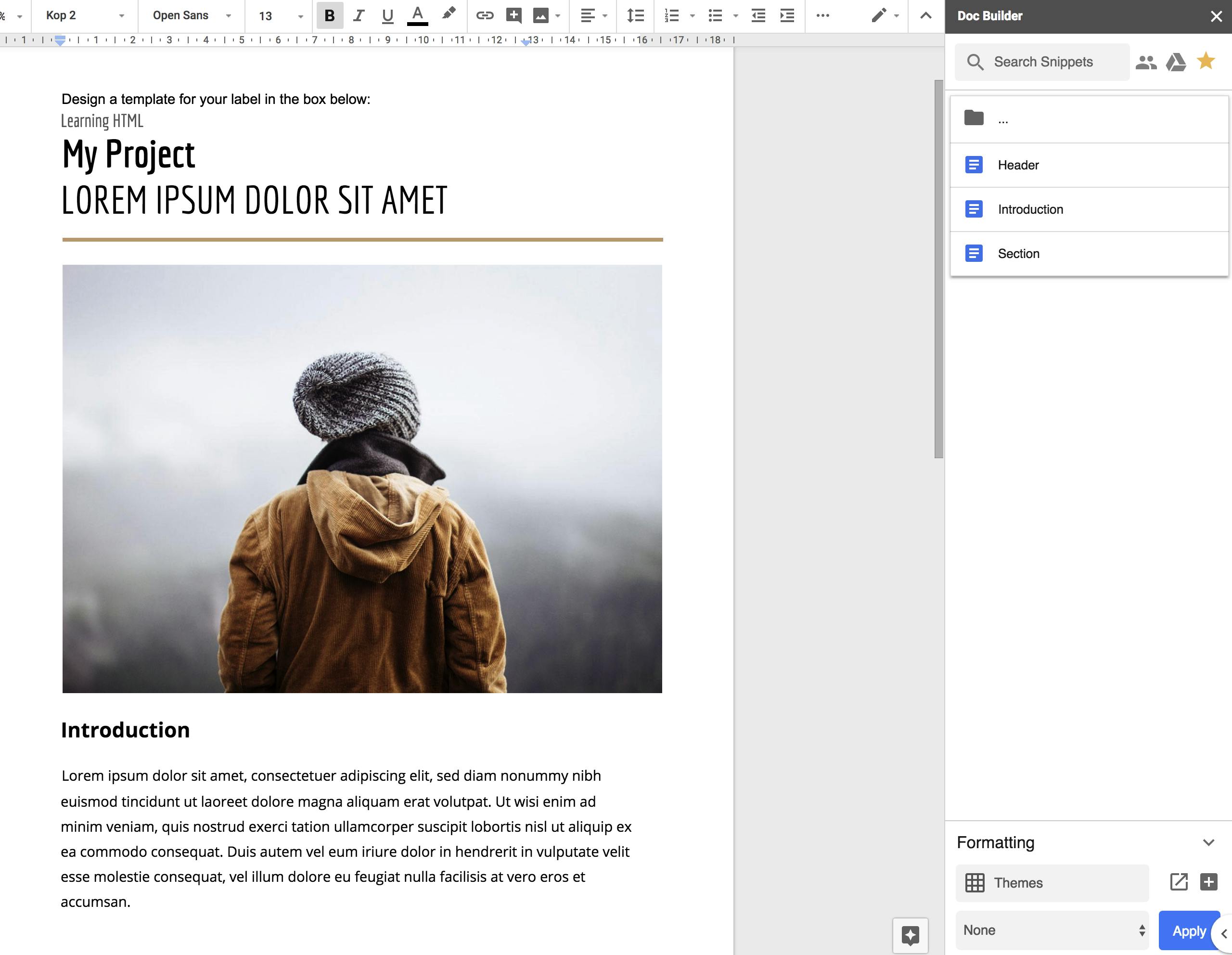 Gebruik je regelmatig dezelfde tekstfragmenten, koppen, berekeningen of illustraties? Dan kun je die onderdelen voortaan uit de zijbalk halen! Wanneer je Doc Builder de eerste keer opent, vind je een verzameling demofragmenten waarmee je aan de slag kunt. Om een onderdeel aan je document toe te voegen, plaats je de cursor op de positie waar het fragment moet komen en dan klik je op het fragment in de zijbalk. Deze fragmenten zijn eigenlijk gewoon bestaande Google-documenten die je organiseert in mappen binnen Google Drive. Je kunt die mappen markeren met een ster aan de rechterkant van de mapnaam. Doc Builder heeft ook een sectie Formatting om al je persoonlijke stijlen vast te houden. Standaard zitten er tien stijlen in, maar via de knop Open Themes Sheet kom je bij een spreadsheet waar je heel makkelijk nieuwe stijlen vastlegt voor normale tekst, kop 1, kop 2 enzovoort.