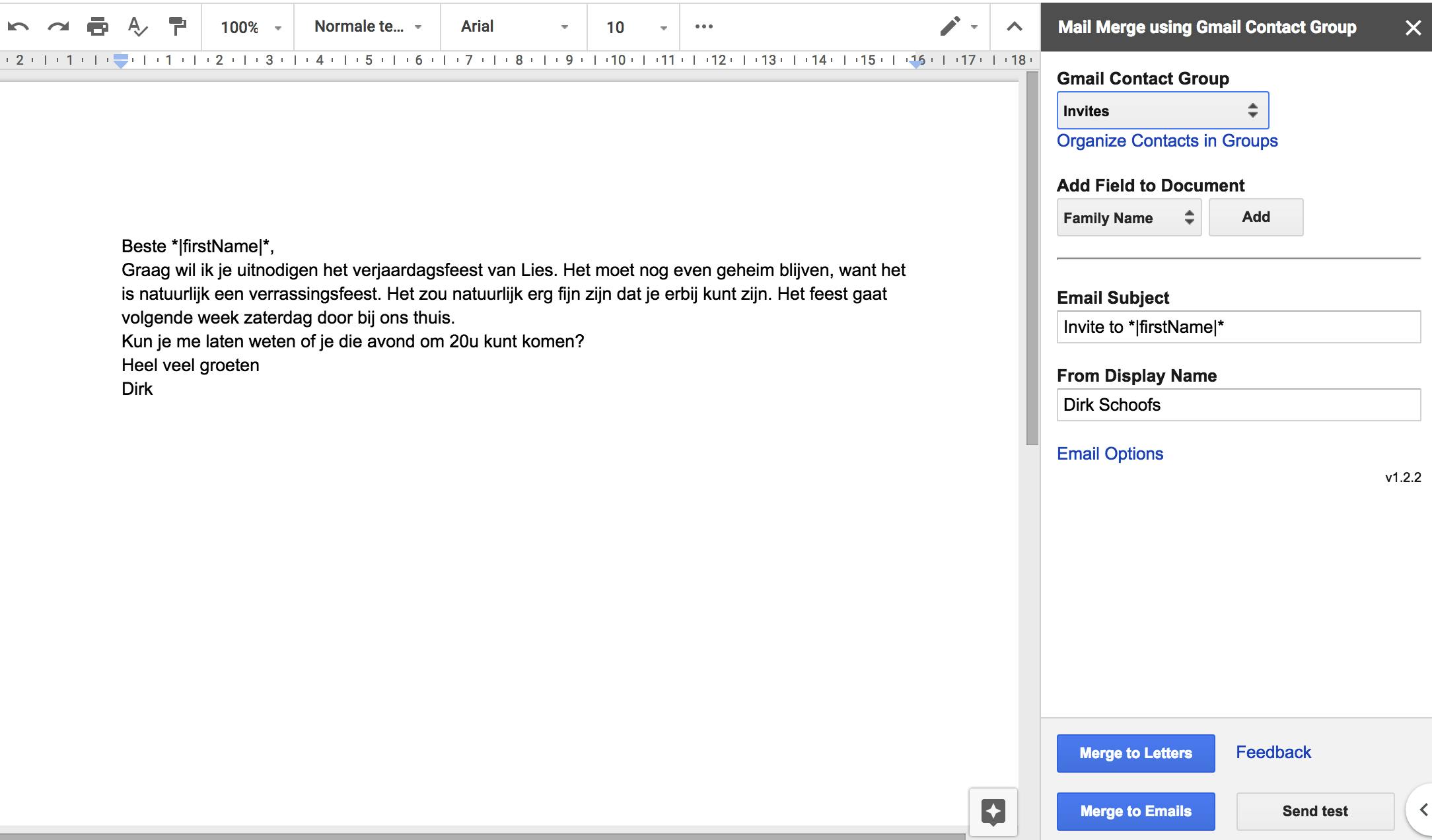 Een van de gemakkelijkste manieren om gepersonaliseerde brieven of e-mails te versturen, is met Mail Merge Contacts. Je moet natuurlijk eerst de contactgegevens beschikbaar maken via Google Contactpersonen. Daarna stel je een document op met variabelen, bijvoorbeeld: voornaam, telefoonnummer, adres. Klik op Merge to Letters om gepersonaliseerde documenten te maken die je wilt afdrukken. Wanneer je Merge to Emails gebruikt, worden het sjabloon en de contacten samengevoegd in gepersonaliseerde e-mailberichten die je vanuit je Gmail-account verzendt.