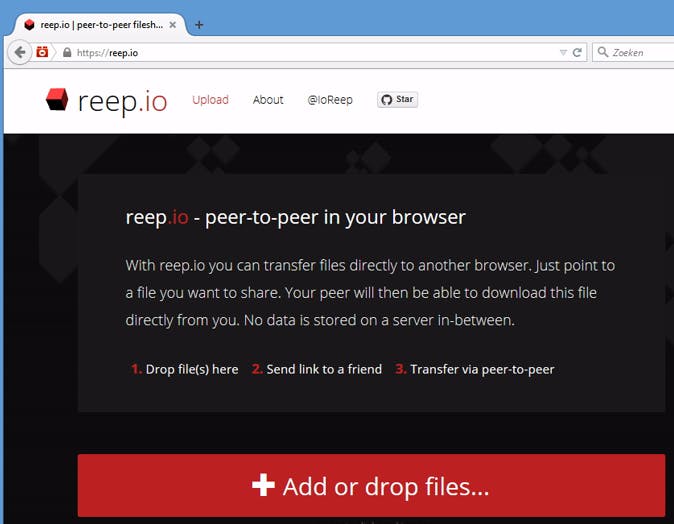 Iedereen is bekend met WeTransfer.com, de ultieme dienst om grote bestanden van A naar B te krijgen. Een klein nadeel van deze dienst is dat er gebruik wordt gemaakt van een tussenserver. Hierop wordt jouw bestand geplaatst, waarna de geadresseerde een link krijgt via mail naar dit bestand. Dankzij Reep.io kun je bestanden versturen tussen twee browsers en wordt de tussenserver overgeslagen. Dit principe wordt ook wel peer-to-peer of p2p genoemd. Reep.io is vooral handig als je controle wilt houden over hetgeen je verstuurt. Het kan ook tijd sparen omdat je het bestand niet eerst hoeft te uploaden alvorens je het verstuurt.