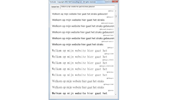 Het programma laadt alle aanwezige lettertypes. Boven in beeld kun je een zinnetje intypen, waarna deze tekst getoond wordt in de verschillende fonts. Vooral het overzicht en de snelheid waarmee dit gebeurt, is heel prettig. Het scrollen gaat soepel en Fonticate helpt bij het inperken van de overvloed aan lettertypes.