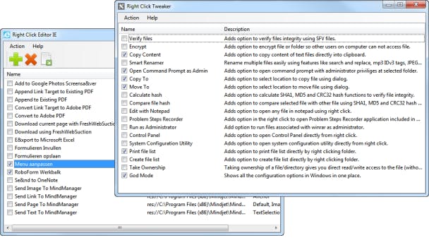 De rechtermuisknop is een krachtig hulpmiddel om snel dingen gedaan te krijgen met de Windows Verkenner. Met Right Click Enhancer voeg je extra functies toe. Klik in het hoofdscherm op Right Click Tweaker. Hier kun je bijvoorbeeld Copy to en Move to activeren om bestanden/mappen snel naar een andere locatie te kopiëren. Met Run as Administrator wordt een programma uitgevoerd als beheerder. Klik in het hoofdscherm op Send to manager om de opties van het rechtermuisknopmenu Kopiëren naar aan je wensen aan te passen. Met Right click editor IE kun je het rechtermuisknopmenu in Internet Explorer aanpassen.