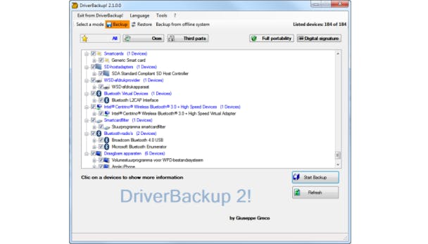 Maak voordat je een herinstallatie overweegt even een kopietje van al je stuurprogramma's met DriverBackup. Geef het programma even de tijd om alle stuurprogramma's te vinden. Je kunt selectief aanvinken welke stuurprogramma's je wil back-uppen, maar de snelste slag maak je met de knop All. Hiermee selecteer je alle stuurprogramma's. Klik op Start Backup en wijs met Browse een usb-stick aan met voldoende opslagruimte. De vereiste ruimte vind je boven in beeld. Klik nogmaals op Start Backup en de stuurprogramma's worden veiliggesteld naar de usb-stick.