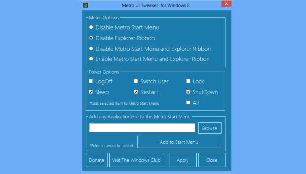 Er is al veel geklaagd en geschreven over Windows 8 en dan met name over het ontbreken van het klassieke startmenu. Metro UI Tweaker for Windows 8 lost dit euvel niet op, maar richt zijn pijlen wel op ander leed. Sommige mensen kunnen niet wennen aan het lint (ribbon), het nieuwe menu van Windows Verkenner. Ook het gemis van een tegel om je computer mee uit te schakelen ontbreekt. Deze functies zijn eenvoudig in te stellen met Metro UI Tweaker for Windows 8.