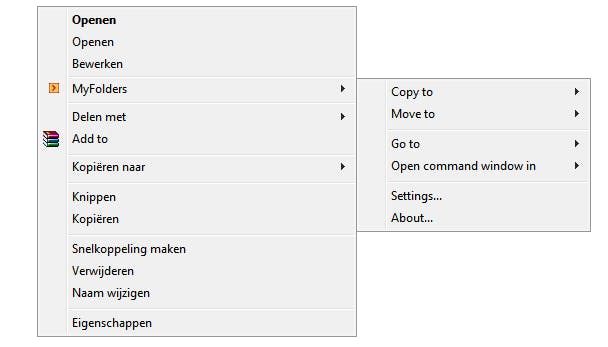 Vanaf nu heb je overal vanuit de Windows Verkenner toegang tot je favoriete mappen. Klik bijvoorbeeld met de rechtermuisknop op een bestand, kies MyFolders / Copy en selecteer de bestemming. De optie MyFolders / Move to is ook beschikbaar om bestanden/mappen te verplaatsen.