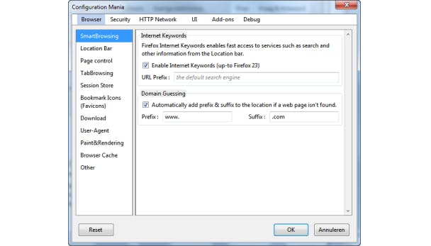 Tip 15 Configuration Mania maakt geavanceerde Firefox-instellingen toegankelijker.