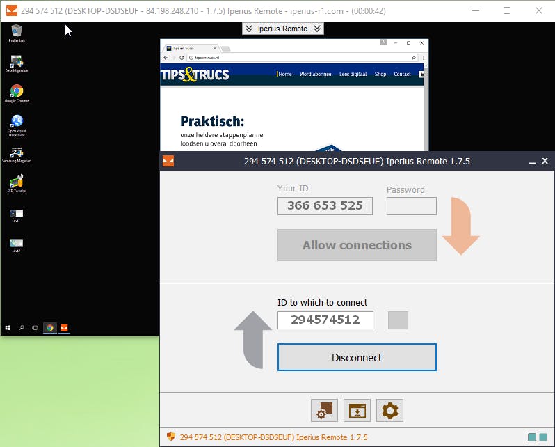 nood. Beginnen we met het laatste scenario. De bedoeling is dat beiden de tool opstarten - een installatie is niet eens vereist. Je kennis geeft aan dat die een verbinding wilt toestaan en zodra jij zijn ID en wachtwoord in je eigen programmavenster invult, kun je de computer van je kennis overnemen, inclusief bestanden uitwisselen en chatten.
