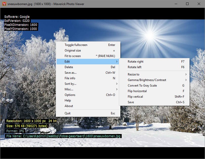 Wanneer je met de muisaanwijzer boven een foto zweeft verschijnt onderaan een menubalk van waaruit je door de foto’s kunt bladeren, gedetailleerde informatie over de foto kunt opvragen, de foto kunt roteren of schermvullend maken, enz. Vanuit het contextmenu van een getoonde foto komen nog meer opties beschikbaar, zoals (her)sorteren op diverse criteria, in- en uitzoomen, converteren en aanpassen van contrast, helderheid en gamma. Goed nieuws ook voor vingervaardige computeraars: Maverick Photo Viewer laat zich met circa 50 sneltoetsen haarfijn aansturen.