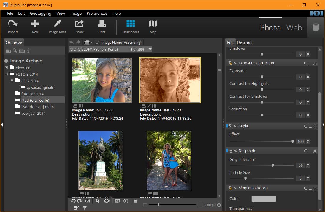 StudioLine Photo Basic is gratis, maar wil je er blijvend mee aan de slag dan moet je je wel gratis registreren binnen de 30 dagen. Een van de hoofdcomponenten is een fotobeheermodule, waarbij je zelf beslist of je de geïmporteerde foto’s naar een interne database kopieert of alleen met een koppeling naar de originele foto’s wilt werken. Die foto’s kun je dan in miniatuur of schermvullend bekijken, of in de vorm van een diashow. Naast de EXIF- en IPTC-metadata kun je ook eigen tags aan de foto’s hangen en op basis hiervan kun je dan makkelijk naar foto’s zoeken.