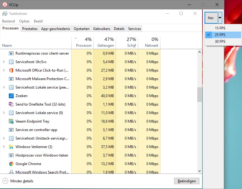 Bij sommige tools worden we blij van de vele functies die het aanbiedt. Bij VClip is dat eigenlijk andersom en zijn we vooral gecharmeerd van de eenvoud van het programma. We kennen namelijk geen andere tool die zich zo makkelijk laat bedienen voor het maken van screencasts (filmpjes van wat er op je scherm gebeurt). Wanneer je het portable programma opstart verschijnt een verplaatsbaar en schaalbaar venster waarvan je het transparante gedeelte moet positioneren boven het schermdeel dat je in je screencast wilt opnemen. De tool is compatibel met HiDPI-schermen en diverse schalingsniveaus. Standaard wordt ook het geluid mee opgenomen dat uit je luidsprekers komt. Je hoeft nu alleen nog maar de opname-knop in te drukken waarbij je wel nog de gewenste framerate kunt aangeven (15, 25 of 30 frames per seconde). Zodra je de opname beëindigt kun je die bewaren in de bestandsformaten avi, gif, mp4, ogg of webm.
