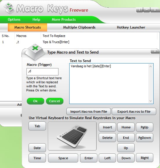 Je zou ervan versteld staan hoeveel repetitieve taken je op een pc uitvoert, zoals het intikken van je e-mailadres, het surfen naar een favoriete site of het opstarten van een programma. Met Macro keys kun je dergelijke handelingen in een sneltoets of tekenreeks opslaan, zodat je die veel sneller kunt uitvoeren. Het programma bevat drie tabbladen en is erg gebruiksvriendelijk. Op het eerste tabblad definieer je tekstmacro’s, zodat je bijvoorbeeld maar in een willekeurige applicatie iets als ‘,e’ hoeft in te tikken om die tekstmacro automatisch door je volledige e-mailadres te zien vervangen. Met behulp van een virtueel toetsenbord kun je hierin ook speciale toetsen als PgUp, Tab enz. opnemen.
