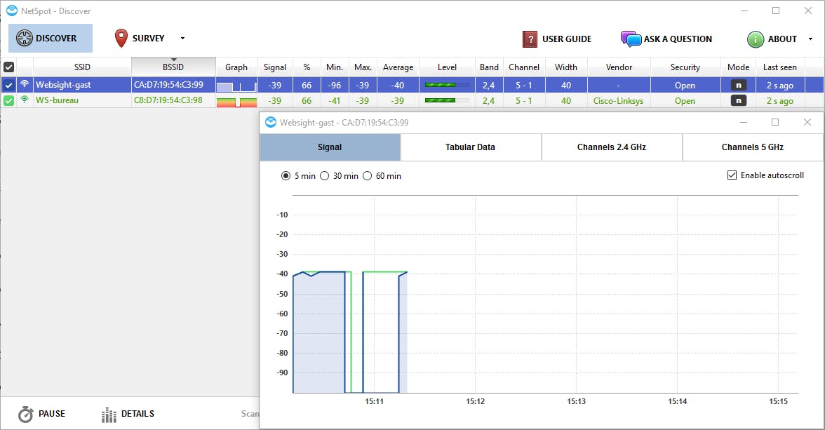 Op het ene tabblad krijg je een realtime overzicht van alle gedetecteerde draadloze netwerken, met informatie als (B)SSID, signaalsterkte (in grafieken en in dBM-waarden), wifi-band, kanaal, kanaalbreedte, beveiliging en netwerkmodus (802.11ac bijvoorbeeld).