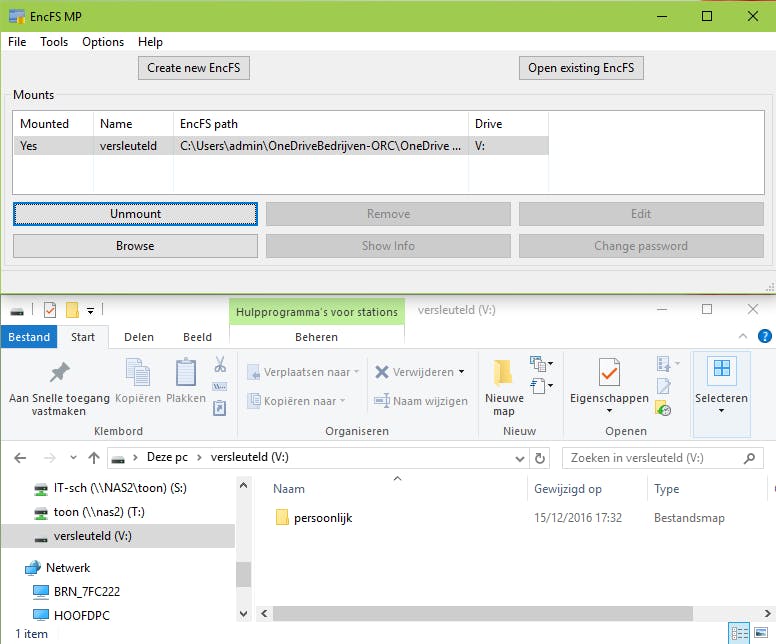 Net als Challenger hierboven is ook EncFS MP een encryptietool, maar de opzet ervan is wel helemaal anders. Met EncFS MP is het de bedoeling dat je op je lokale schijf eerst een lege map creëert. Dat kan bijvoorbeeld een submap zijn van de synchronisatiemap van een cloud-opslagdienst als OneDrive, Dropbox of Google Drive. Vervolgens geef je aan dat je de toekomstige inhoud van die map wilt versleutelen. Standaard is dat met AES 192-bits, maar de encryptiemethode is instelbaar. Nadat je een stevig wachtwoord hebt toegekend kun je aan deze map een stationsletter koppelen. De bedoeling mag duidelijk zijn: deze map duikt dan even later als een virtueel station in je verkenner op. Alles wat je hier opslaat wordt automatisch versleuteld, maar zolang het virtuele station (na het invullen van je wachtwoord) gekoppeld blijft, is de inhoud toegankelijk. Zodra het station ontkoppeld is blijven alleen nog versleutelde data achter. EncFS MP is beschikbaar voor Windows en macOS.