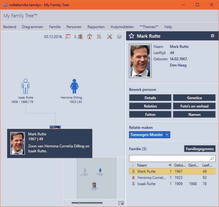 Standaard krijg je een stamboom uitgetekend van de ganse familie, maar via een miniatuurpaneel kan je ook snel in- en uitzoomen op de boomhiërarchie. My Family Tree blinkt bovendien uit in de rapportering. Er zijn rapporten over een persoon, over een familie of over een specifiek onderwerp, zoals verjaardagen of huwelijksaangiftes. Je bepaalt telkens zelf wat je precies te zien wilt krijgen in zo’n (html-)rapport. Om Murphy voor te blijven voorziet het programma in diverse back-up en exportmogelijkheden.