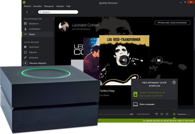 De beste optie om nog meer van Spotify te genieten is met een goede koptelefoon of door de muziek uit de boxen van je stereo-installatie te laten schallen. Als je Spotify Premium hebt is Gramofon (49 dollar, ca. 45 euro) een aanrader. Met dit kastje kun je Spotify-muziek draadloos 'aansturen' vanaf je computer, smartphone en tablet en afspelen op je stereo-installatie. Bij soortgelijke bluetooth-oplossingen wordt de muziek afgespeeld op je computer (smartphone of tablet) en draadloos verstuurd naar een bluetooth-kastje op je stereo-installatie. Dit komt de geluidskwaliteit niet ten goede. Gramofon biedt Spotify Connect en dat houdt in dat je muziek direct wordt afgespeeld vanaf de Gramofon.