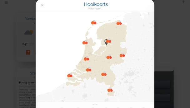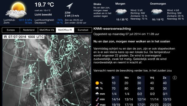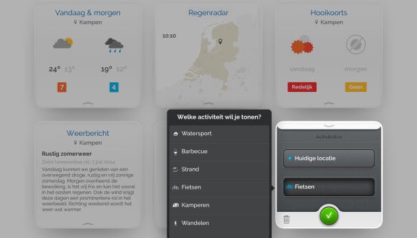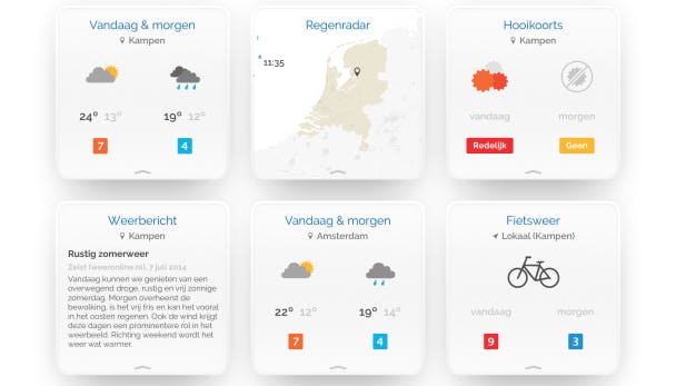 Daarnaast zijn er widgets voor specifieke doelgroepen, zoals de hooikoortsverwachting. Heel handig voor wie last heeft van pollen en een veilig heenkomen wil zoeken als het allemaal te erg wordt. Erg leuk is ook de activiteiten-widget. Uit een lijst kies je bezigheden zoals fietsen, wandelen of barbecueën. De widget geeft voor vandaag en morgen een cijfer van 1 tot 10, waarbij een hoger cijfer een geschiktere dag betekent.