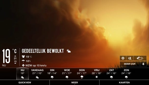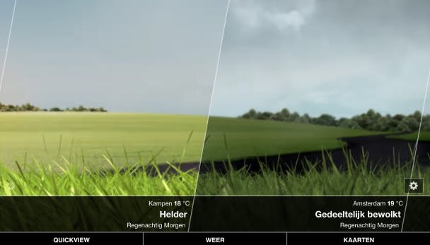 Rustige, kleurrijke animaties nemen het grootste deel van het scherm in beslag. Slechts een derde bevat cijfers. Hierdoor is het in één oogopslag zichtbaar wat voor weer het nu is, voor wie geen zin heeft om uit het raam te kijken. In Quickview kun je het weerbeeld van meerdere locaties zien (in de gratis versie maximaal twee), als je wilt weten of het bijvoorbeeld in Amsterdam wél droog is, terwijl jij op het strand in de regen zit.