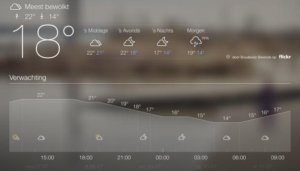 Het startscherm bestaat uit een Flickr-foto van de huidige locatie (of één van je voorkeurssteden) met een snel overzicht voor de komende dagen. Een tikje op het scherm voegt daar een 24-uursverwachting aan toe, met temperatuursverloop en bewolking. Dit is echter nog maar het topje van de ijsberg. Yahoo Weer geeft namelijk verschrikkelijk veel informatie door omhoog te vegen.