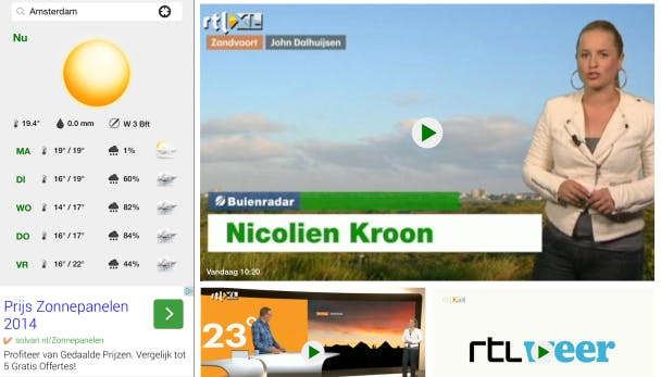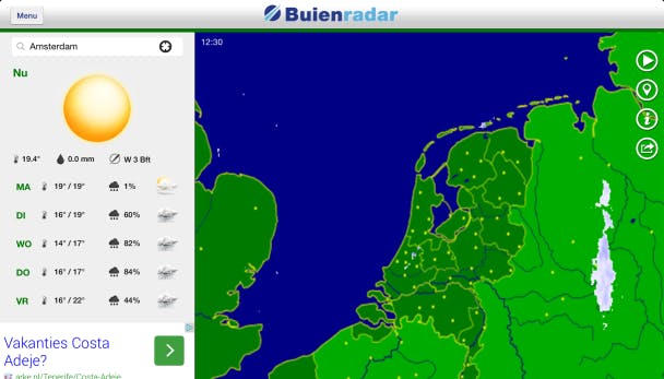 Helaas is de app met zijn startschermen lang niet zo gebruikersvriendelijk als Weeronline HD met zijn widgets. Het blijft er uitzien als de Buienradar-website van een paar jaar geleden. Dat zal sommigen een vertrouwd gevoel geven, maar het komt op ons inmiddels wat amateuristisch over. En dat is jammer, omdat de basis heel sterk is. Buienradar zou echt eens een goed ontwerpbureau moeten uitnodigen. Wat ook niet helpt is het plotseling verschijnen van schermvullende advertenties. Die wekken onmiddellijk irritatie, wat nou niet de bedoeling zal zijn voor een commerciële boodschap. Er is een plus-versie verkrijgbaar, waarbij je voor 1,79 euro per jaar de reclame kunt verwijderen. Ook hier is het jammer dat we niet met een eenmalige betaling van de reclame verlost zijn.
