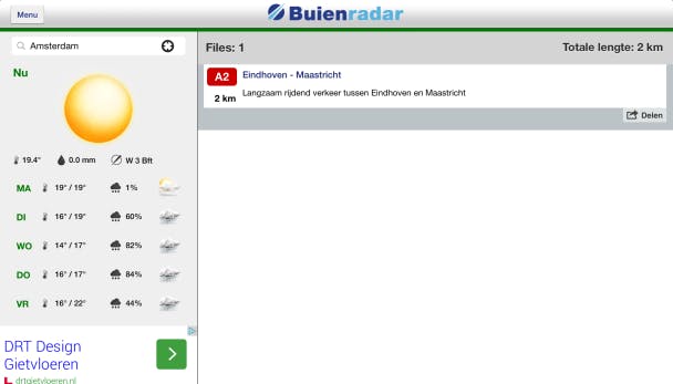 Na alle flitsend vormgegeven applicaties is Buienradar toch een beetje een koude douche. De app opent met de blauwgroene kaart van Nederland, met daarop de buienradar. Links zie je de voorspelling voor de huidige locatie. Gelukkig is er meer informatie voorhanden. De kaart kun je opzij vegen, dat onthult meerdaagse verwachtingen, het weerbericht van RTL en eventueel ook file-informatie.