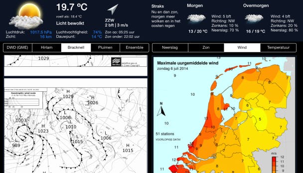 De app toont naast alle ruwe data een eenvoudige voorspelling voor de dag en de week, plus een uuroverzicht. Zelfs een regenradar is aanwezig. Het is ook de enige app die we aantroffen met een zichtverwachting. Helaas legt de app niet uit wat alle kaarten doen of betekenen. Wij wisten niet wat we aan moesten met een 'Bracknell'- of 'Hirlam'-kaart. Het zal ongetwijfeld voor de kenners gesneden koek zijn, maar wij weten niet wat een 'geostrophic windscale' is.