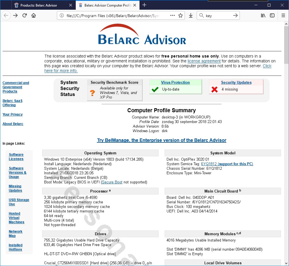 Om in één overzicht zoveel mogelijk nuttige informatie over je systeem te krijgen is er Belarc Advisor. Het uitvoerig verslag lees je niet in een scherm van het programma, maar in een browservenster. Je vindt er de gangbare info over de hardware en je krijgt een lijst van alle geïnstalleerde software. Je ziet welke verwisselbare media onlangs zijn aangesloten enzovoort … Ken je de licentiesleutels niet meer van programma's die je ooit aankocht? Geen nood, zelfs die informatie staat in de lijst.
