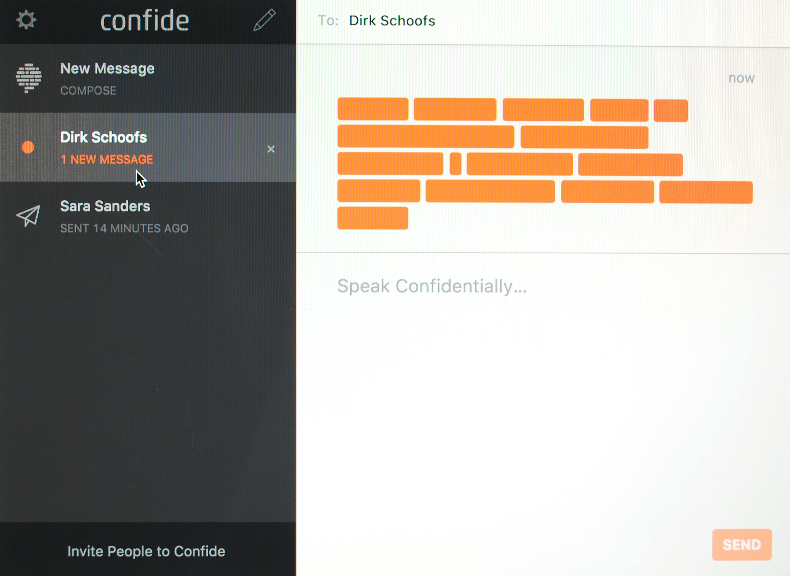 Wie bezorgd is om zijn privacy staat argwanend tegen communicatielijnen die hijzelf niet beheert. Confide is een vertrouwelijke messenger voor macOS, Windows, iOS en Android. Deze messenger gebruikt end-to-end-codering, wat betekent dat de encryptiesleutel op ieder apparaat wordt gegenereerd en bewaard. Wie het bericht ontvangt, krijgt eerst alleen oranje blokjes te zien en door er met de vinger of de muisaanwijzer over te gaan verschijnt de tekst. Nadat de ontvanger de boodschap heeft gelezen, verdwijnt de tekst. Bovendien beveiligt Confide de boodschap zodat je geen schermafdrukken kunt maken.