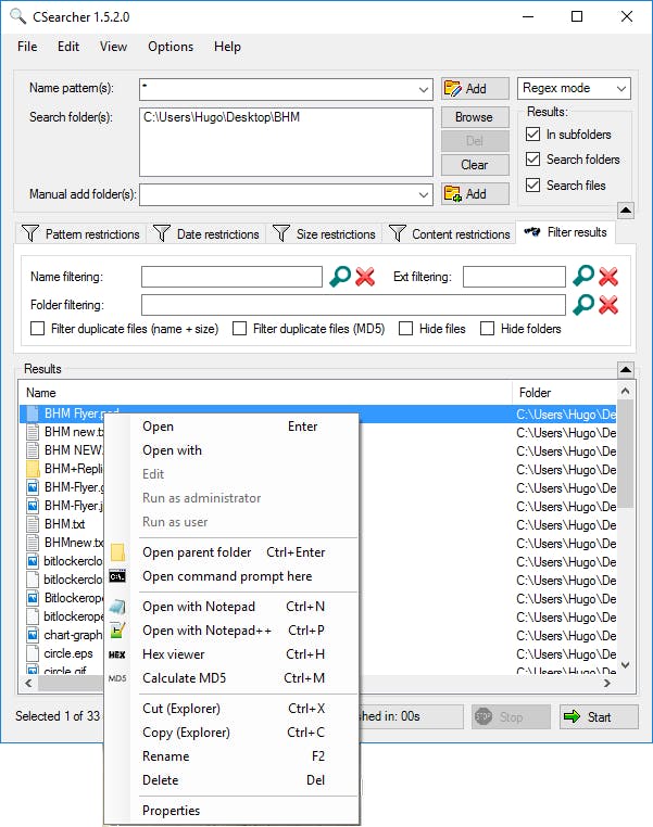 De standaard zoekmachine van Windows 10 kun je niet echt snel noemen. Bovendien vraagt een zoekopdracht via die weg veel van de systeembronnen. Het alternatief is CSearcher, een lichtgewicht portable app die je niet eens hoeft te installeren. In slechts één venster stel je alle zoekparameters in. Normaliter kan CSearcher ook naar tekst binnen bestanden zoeken, maar dit levert niet altijd het gehoopte resultaat op. In de zoekopdracht kun je een zoekbereik en uitzonderingen opgeven.