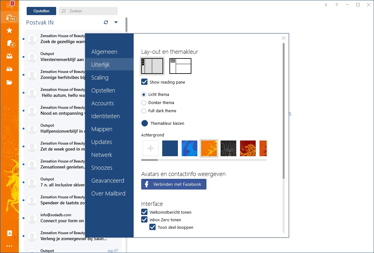 Voor sommige gebruikers is de layout van Outlook te complex. Mailbird is daarentegen een programma dat de meeste mensen al na vijf minuten onder de knie hebben. Beheer al je e-mails en contacten van meerdere accounts in één inbox. Daarbij heeft deze mailclient functies die in veel opzichten net zo geavanceerd zijn als die van Outlook. Mailbird ziet er goed uit, bovendien kun je kiezen uit een groot aantal kleurenthema's. Opvallend is dat dit mailprogramma apps integreert zoals Dropbox, Google Agenda, WhatsApp, Dropbox, Facobook en Twitter.
