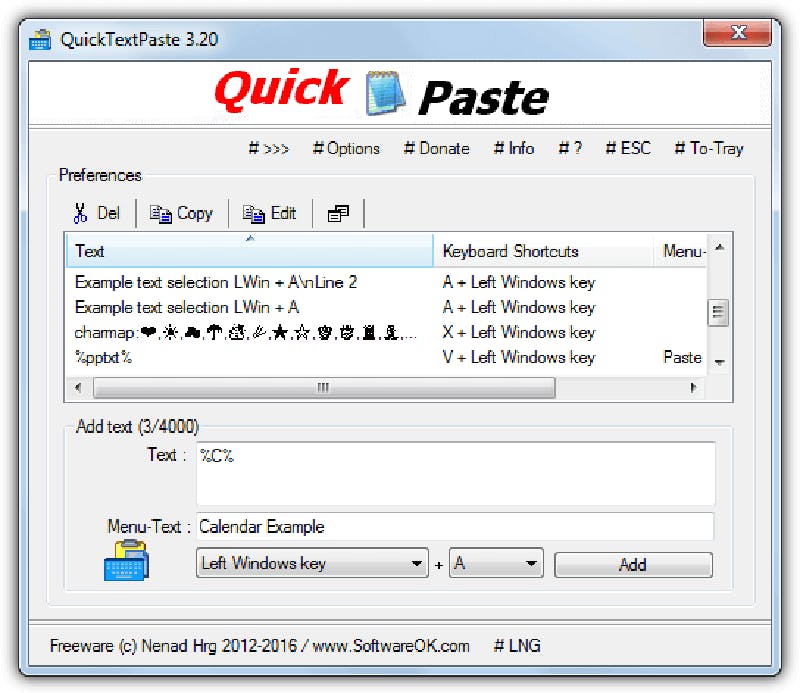Wie veel e-mails of teksten schrijft, moet regelmatig dezelfde tekst typen. Met QuickTextPaste plak je veelgebruikte tekst door middel van sneltoetsen. Het programma is slechts 10 Kb groot en ziet er erg sober uit. Er is een tekstvak voor het invoeren van de tekst die je straks met de sneltoets plakt. Bovendien kun je, zonder de vingers van het toetsenbord te halen, nog andere acties uitvoeren zoals programma's starten, webpagina's openen of afbeeldingen van het klembord plakken.