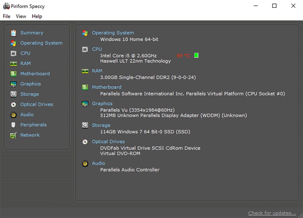 Speccy is een van de meest gedetailleerde systeeminfo-hulpprogramma's die details aanreikt die je vaak niet vindt in de systeeminformatie-app van Windows. Gebruikers kunnen de systeemgegevens naar TXT- of XML-documenten exporteren om ze af te drukken. Met deze tool hou je ook de temperatuur in de gaten van vitale onderdelen, zodat je problemen kunt voorkomen. De normale temperatuur van de cpu is 55 graden of lager, terwijl de grafische kaart gemiddeld tussen de 60 à 80 graden heet is. De gratis versie biedt al heel wat info, maar voor een kleine vijftien euro heb je een nog uitgebreidere versie.