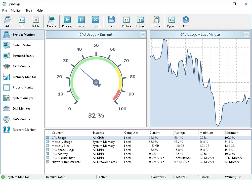 In de auto heb je metertjes om snelheid, toerental en temperatuur in de gaten te houden en Windows heeft de prestatie-tab van Windows-taakbeheer. SysGauge toont de geheugenbelasting, de processorbelasting, schijfsnelheid, internet- en netwerksnelheid. Op die manier weet je meteen wanneer er bepaalde dingen niet kloppen en onderneem je direct actie of pas je bepaalde zaken aan. Alle informatie wordt verzameld, opgeslagen en die krijg je dan weer in handige grafieken te zien.