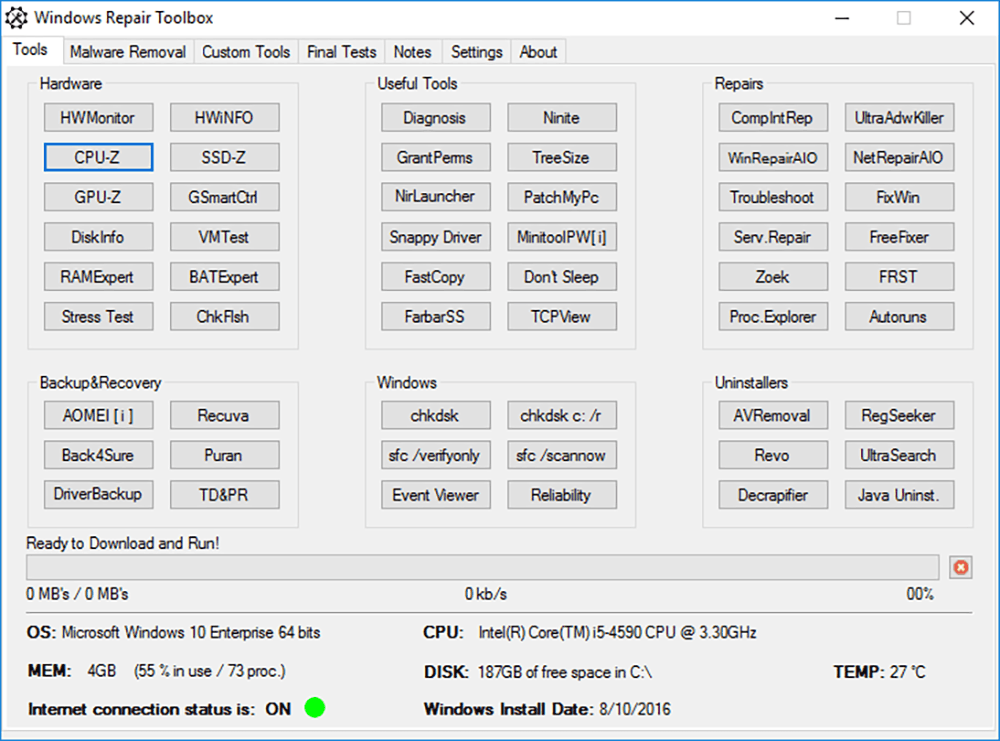Een bescheiden programma van amper 2 MB met een enorme gereedschapskist, dat is Windows Repair Toolbox. Het openingsscherm begroet je met 54 knoppen die allemaal een functie hebben. Je hoeft ze enkel aan te klikken zodat deze verzamelaar de juiste versie downloadt en opstart. Je kunt met een gerust hart een programma ophalen en gebruiken omdat er niets wordt geïnstalleerd op de pc, behalve de twee tools die met [i] zijn gemarkeerd. Windows Repair Toolbox bevat malware-jagers, uninstallers, back-up- en hersteltools.
