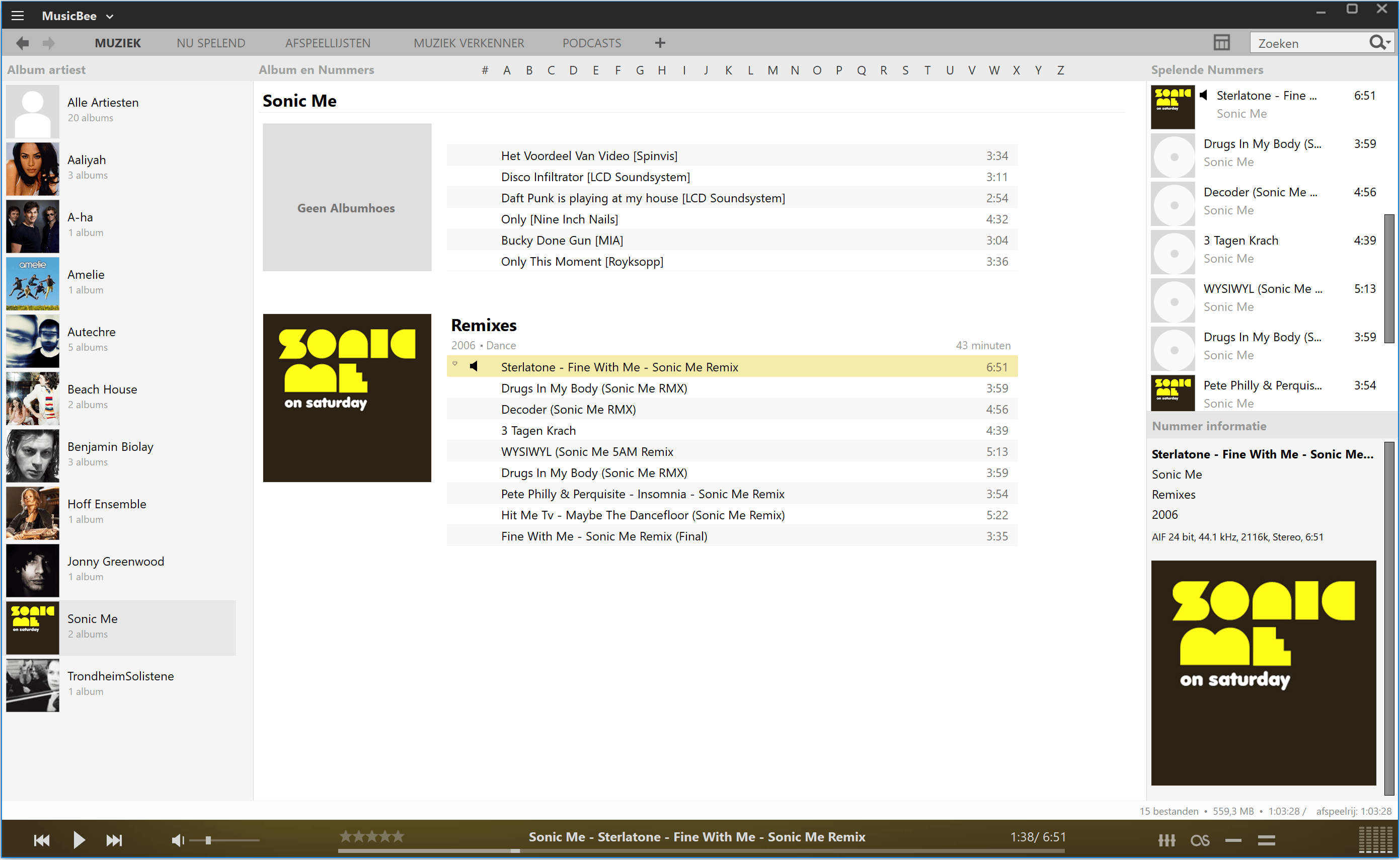 MusicBee vraagt je eerst in welke taal je de speler wilt bedienen en biedt daarna aan om je harde schijf te scannen op muziekbestanden. Uiteraard kun je ook gewoon een map selecteren. Het programma importeert alle 159 bestanden uit de test-bibliotheek, inclusief de twee flac-bestanden. Links zie je meteen de beschikbare album art weergegeven. Bij het A-ha album uit onze bibliotheek mist de album art; deze voeg je handmatig toe of laat je via de zogenaamde auto-tag-optie automatisch toevoegen. Met MusicBee kun je gemakkelijk metadata toevoegen en ook de dubbele song van Sonic Me die in onze bibliotheek onder een iets andere naam staat, levert geen problemen op voor het programma. MusicBee toont zich in de bediening en functies erg volledig. Zo kun je bestanden zonder problemen converteren van wav naar mp3 of flac. De lijst bestandsformaten die MusicBee ondersteunt, is indrukwekkend: zelfs ogg vorbis, aac en wma kunnen zonder problemen worden afgespeeld. Liedjes kun je naar afspeellijsten kopiëren en met de AutoDJ-optie heb je de hele avond muziek. Een bonus: MusicBee is ook te besturen met een Android-smartphone. Hiervoor download je MusicBee Remote uit de Google Play Store.