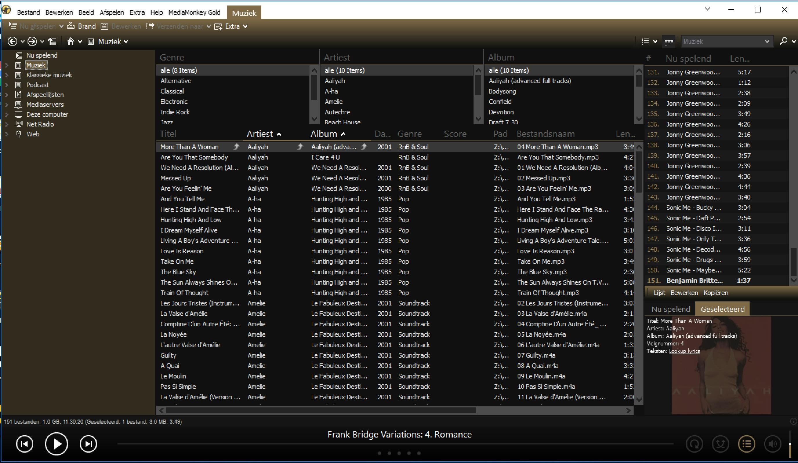 MediaMonkey is een oude bekende. Het programma bestaat sinds 2001 en is één van de betere opties, mede omdat het vrijwel alle formaten ondersteunt. De interface is iets minder duidelijk dan die van de concurrentie en het duurt even voordat je door hebt waar alles zit. Na het importeren blijken er maar 151 van onze 159 bestanden in MediaMonkey te zitten. De twee flac-bestanden zijn geen probleem, maar acht andere liedjes worden niet geïmporteerd: de foutoplossing geeft aan dat er bij twee bestanden een fout is aangetroffen bij het inlezen; voor de overige zes bestanden is het niet duidelijk waarom ze niet werden geïmporteerd. Concurrent MusicBee speelt deze bestanden gewoon af. MediaMonkey heeft een equalizer aan boord zodat je bijvoorbeeld de bassen iets kunt aandikken. Net als MusicBee beschikt het programma verder over een party-modus. Het programma heeft enorm veel functies en kan converteren in allerlei exotische formaten. Het rippen van een cd in hoge kwaliteit is overigens alleen mogelijk met de Gold-versie van 24,95 dollar. Ook het automatisch vinden van album art is alleen beschikbaar voor betalende gebruikers.
