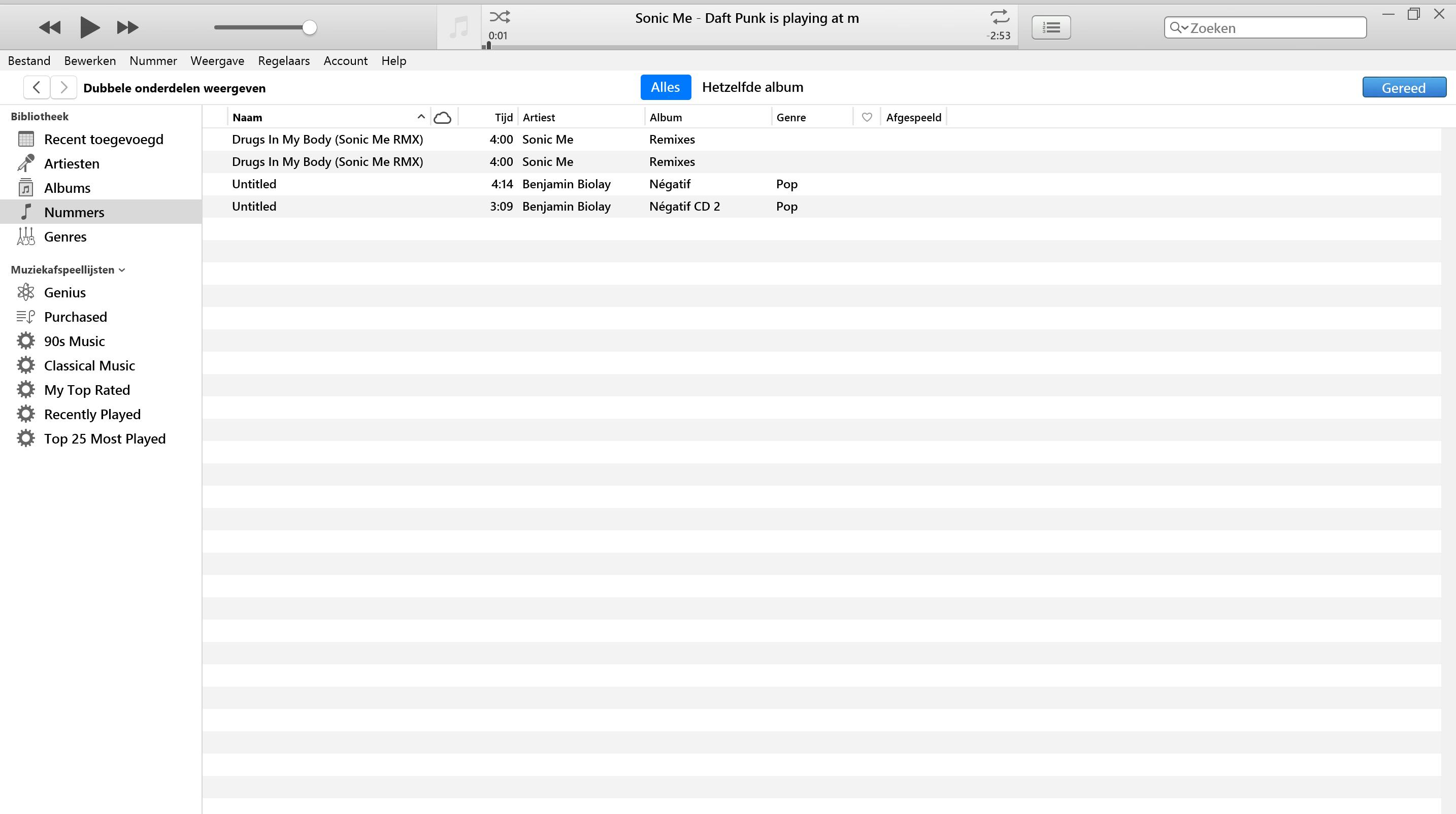 Op de Mac is iTunes de meest logische optie, maar het programma is ook voor Windows-gebruikers verkrijgbaar. Bij het importeren komen de meeste tracks uit de bibliotheek goed door; de flac-bestanden worden echter niet door iTunes gelezen. De twee bestanden die MediaMonkey niet kon inladen en waarbij een foutmelding werd gegeven, worden in iTunes niet eens aan het programma toegevoegd. De dubbele track in onze bibliotheek wordt door iTunes eenvoudig ontmaskerd, omdat het programma de metadata als tracknaam weergeeft in plaats van de bestandsnaam. Handig is dat iTunes bij het weergeven van duplicaten veel informatie geeft. Zo zie je hoe lang een song duurt en kun je die snel afspelen. Zo weet je zeker dat je het juiste nummer verwijdert. iTunes is bovendien erg overzichtelijk, kan automatisch album art downloaden als je bent aangemeld met je Apple ID en kan muziek converteren naar mp3, aac of Apple Lossless. Je kunt bovendien per nummer of album een andere equalizer-instelling kiezen, bestanden uitsluiten van de shuffle-modus of een start- en stoppositie aangeven.