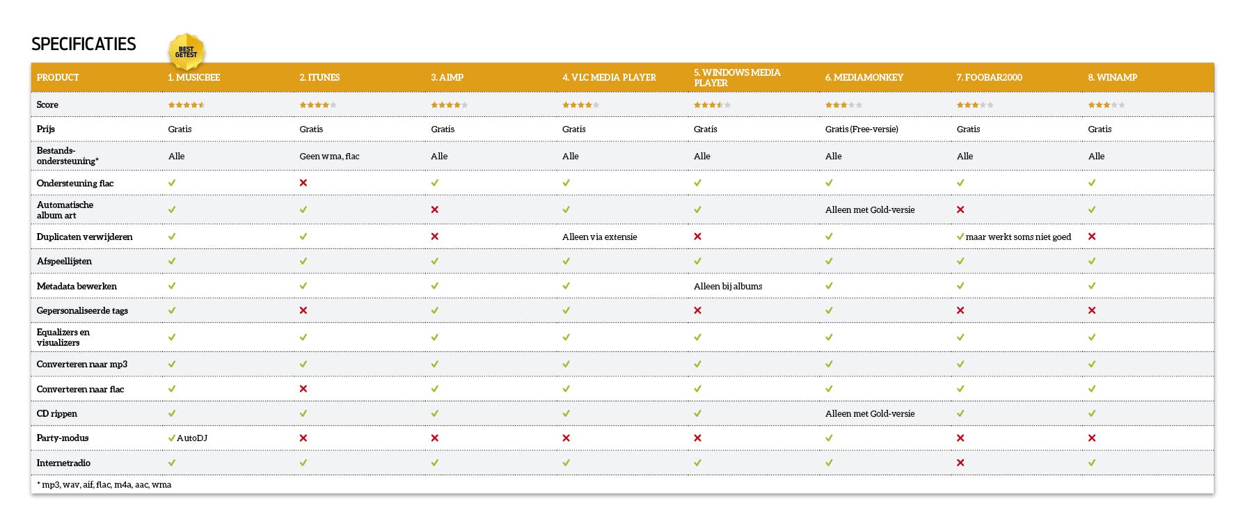 Echt slechte audiospelers hebben we in deze test niet behandeld en qua functionaliteit zitten de meeste programma’s dicht bij elkaar. Om een keuze te maken doe je er goed aan om je af te vragen welke functies voor jou echt noodzakelijk zijn om je muziekbibliotheek te beheren. Heb je volledige ondersteuning van allerlei formaten nodig? Dan is iTunes bijvoorbeeld geen goed idee. Wil je veel metadata veranderen en instellingen per track kunnen wijzigen, dan is iTunes juist weer de beste optie. Wil je dat een programma automatisch op zoek gaat naar album art of gemakkelijk duplicaten kan verwijderen? Dan kun je beter MusicBee of Windows Media Player dan AIMP gebruiken. Over het algemeen scoort MusicBee op alle fronten goed: het ziet er strak uit en heeft heel veel mogelijkheden. Daarom is MusicBee onze keuze voor de beste audiospeler van dit moment. Winamp krijgt nu nog 3 sterren vanwege de grafische problemen, maar we wachten met smart op versie 6.