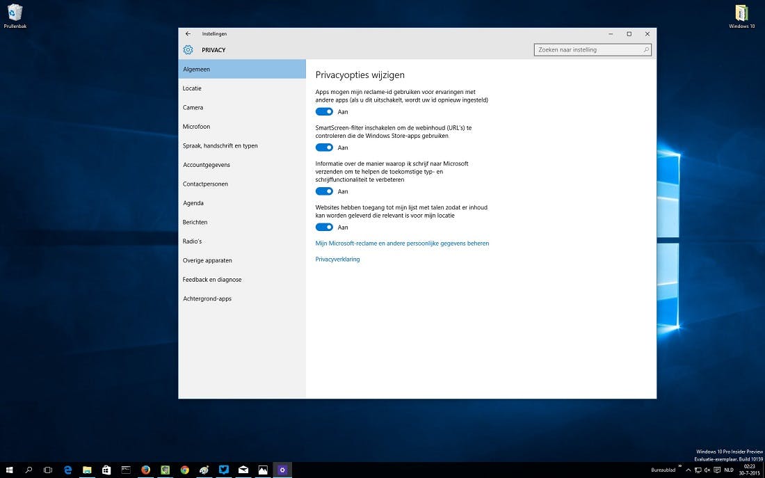 De belangrijkste optie vind je bovenaan het kopje 'Algemeen'. Daar staat 'Apps mogen mijn reclame-id gebruiken...'. Zet die optie uit, want hiermee mogen adverteerders meekijken wat je doet op je systeem en dat willen we natuurlijk niet hebben.