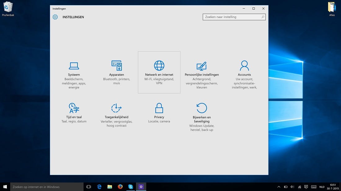 Je doet dat door naar je 'Instellingen' te gaan (via Start of via het Actiecentrum), en daar op 'Netwerk en internet' te klikken.