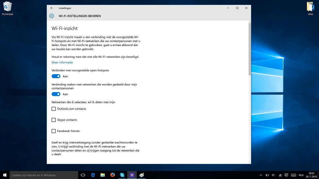 Windows 10 heeft een nieuwe instelling toegevoegd aan de internetopties. De feature heet WiFi Sense, en is bedoeld om je wifi-verbinding te kunnen delen met je vrienden. Dat kan best handig zijn - als je vrienden op bezoek komen hoef je ze niet meer je wifi-wachtwoord te geven, want dat is al met hen gedeeld als ze een contact zijn bij je Outlook-account.