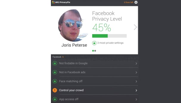AVG is bekend van antivirussoftware. Nu zijn de antivirus-apps van AVG tamelijk overbodig, maar de Privacy Fix-applicatie is dat juist niet. Met de app (ook voor Android) loop je de belangrijkste privacyinstellingen van Facebook en Google na zodat je goed weet welke gegevens van jou openbaar zijn en welke niet. Erg handig om even na te lopen, want er is altijd meer openbaar dan je zelf verwacht.