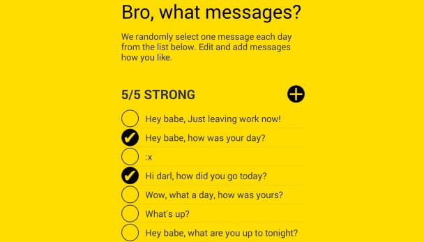 De BroApp zet zichzelf neer als de ultieme relatie-assistent, zodat je zelf meer tijd overhoudt om te hangen met vrienden (Bros). Geef aan wie je vriendin is, welke wifi-netwerken je op het werk, thuis en bij je vriendin hebt, en wat voor berichten je je vriendin wilt sturen en voilà. De app stuurt je vriendin lieve sms'jes wanneer je bijvoorbeeld op het werk aankomt. Maar zal juist geen bericht verzenden wanneer je bij je vriendin op bezoek bent. Dat zou uiterst ongemakkelijke situaties opleveren.