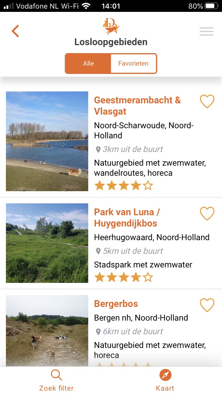 Probeer je graag nieuwe uitlaatrondjes uit, dan is het slim om ze vast te leggen. Op die manier kun je hetzelfde traject later nog eens bewandelen. Download hiervoor de Engelstalige app Tractive Dog Walk (iOS) of Dog Walk - Track your dogs (Android). Hoewel de benamingen verschillen, zijn deze toepassingen afkomstig van dezelfde ontwikkelaar. Zodra je je hebt geregistreerd, geef je aan dat je een wandeling wilt maken. De app doet voor de routeregistratie een beroep op de gps-chip van je smartphone. Geef de app dus toegang tot de locatievoorzieningen van het mobiele toestel. Je maakt tijdens de wandeling vrijblijvend foto’s, zodat je beelden van de route op een later moment kunt terugkijken. Baasjes geven desgewenst aan op welke locaties hun hond een behoefte heeft gedaan, al zien we daarvan het nut niet zo in. Een zinvollere optie is dat je de route live met bekenden kunt delen. De persoon in kwestie ontvangt een link waarop het traject te volgen is. Overigens kun je de routegegevens ook achteraf delen. Bekijk na afloop hoelang je hebt gewandeld en welke afstand je hebt afgelegd. Met deze app bouwen hondenbezitters een overzicht van mooie uitlaatrondjes op.