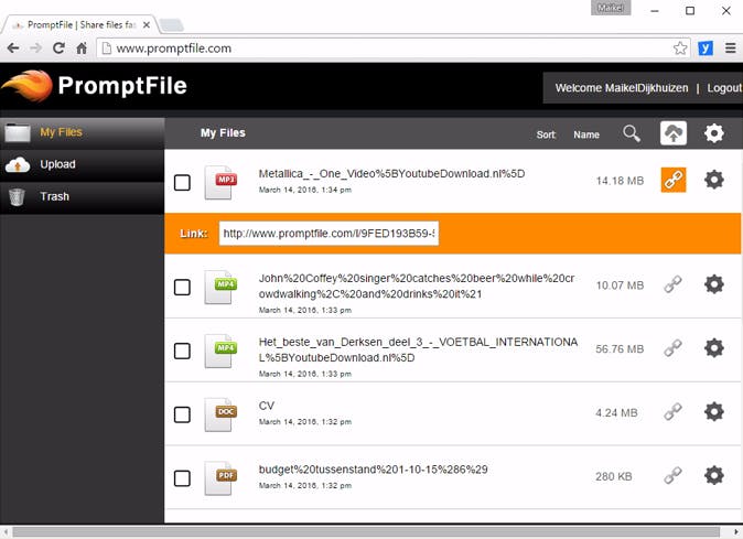Handig is bovendien dat je een YouTube-filmpje rechtstreeks in de cloud bewaart door hiervan de url op te geven. De interface oogt vrij basaal en zou wel iets sprankelender mogen. Opmerkelijk is dat de dienst wel voorbeeldweergaven van foto's, video's en muziek opent in een nieuw tabblad van je browser. De inhoud van documenten wordt niet in de browser getoond. Gebruikers delen van ieder bestand desgewenst een unieke downloadlink met vrienden. Opvallend is dat PromptFile geen betaalde abonnementen aanbiedt, dus de vraag is hoe lang deze ietwat mysterieuze clouddienst het volhoudt.