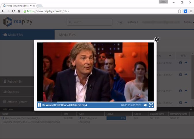 Een groot minpunt is dat RSAplay bestanden verwijdert wanneer ze dertig dagen niet zijn afgespeeld. Gebruik de dienst dus niet voor permanente opslag! De bestandslimiet is met 500 MB ook niet om over naar huis te schrijven. Veel video's hebben namelijk meer ruimte nodig. Het webpaneel ziet er overigens keurig uit. Vanwege de toegepaste encryptie duren uploadtaken wel wat langer vergeleken met andere aanbieders. Je deelt bestanden inclusief de decoderingssleutel. Verder kan deze online opslagdienst video's insluiten ('embedden') binnen een bestaande website. RSAplay heeft helaas geen mobiele apps uitgebracht, al komt daar volgens de makers wel op korte termijn verandering in.
