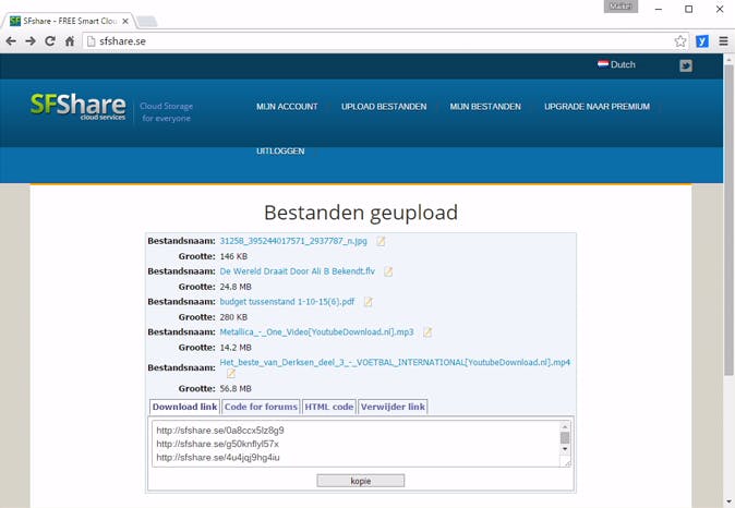 Vergeleken met de concurrentie is SFshare vanwege deze beperkingen wel wat lastiger in gebruik. Wie evengoed besluit om een account aan te maken, komt in lelijke gebruikersomgeving terecht waarin je maximaal vijf bestanden per keer vanaf de harde schijf kunt uploaden. Daarnaast staat het je ook vrij om webfilmpjes op te slaan via het opgeven van url's. In de met advertenties omgeven interface gebruikt SFshare de Nederlandse en Engelse taal door elkaar. Na het uploadproces is er van ieder bestand een downloadlink beschikbaar, die je eventueel deelt met vrienden. Een rechtstreekse downloadfunctie is echter niet voorhanden en bovendien kun je geen voorvertoning van de bestanden opvragen. Voor mobiel gebruik is SFshare niet zo geschikt, want er zijn geen mobiele apps voorhanden.