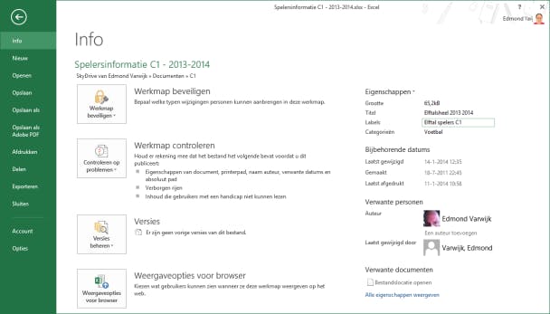 Via de optie Delen kun je het document daarna delen met anderen of publiceren op een intranet of weblog. Speciale aandacht verdient het onderdeel Info. Daar staat veel informatie over het document zoals beveiligingsopties, informatie over vorige versies, maar ook de naam van de auteur, de titel en labels die eraan hangen. Al die informatie kun je bewerken, waarna die informatie onzichtbaar in het document wordt opgeslagen en bijvoorbeeld gebruikt wordt door de zoekfunctie van Windows. Klik achter Titel en Label om informatie toe te voegen of aan te passen, klik op de persoon die als Auteur vermeld staat en kies Persoon verwijderen als het niet de naam van de persoon is die echt aan het document werkt.