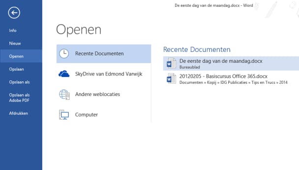 Verder werken aan een bestaand document gebeurt misschien wel vaker dan een heel nieuw document beginnen. En dan is het handig wanneer dat document snel geopend kan worden. Die veelgebruikte documenten en mappen kun je vastpinnen in de Backstage-omgeving en ze voortaan met één klik openen. Klik op Bestand / Openen / Recente documenten. Je ziet nu de bestanden die je onlangs geopend hebt. Hang met de muis over de naam van een bestand en rechts ervan verschijnt een punaise. Klik op het icoontje met de punaise en het document wordt vastmaakt in de lijst. Hetzelfde kun je doen met mappen.